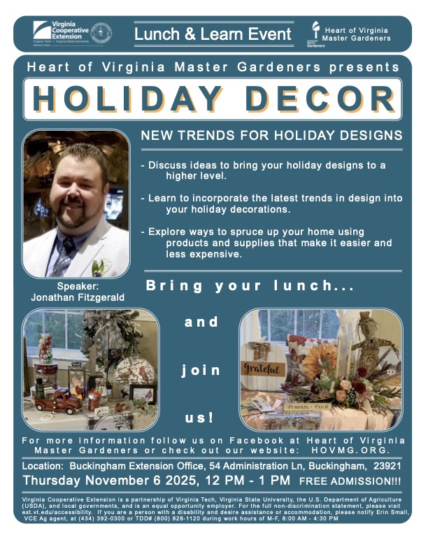 HOVMGA (Cumberland, Buckingham, and Prince Edward Counties) has planned an exciting year of monthly/timely FREE lunch hour workshops and other events just for you! Mark your calendar to join us for these events. Questions? Call our Prince Edward Virginia Cooperative Extension Office, 100 Dominion Drive, Farmville, VA 23901. (Next to Lowe’s) at 434-392-0300.