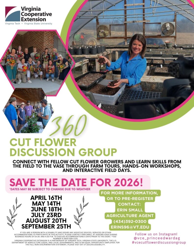 Erin Small, Agriculture Agent for Prince Edward County, is presenting a series of workshops on “Cut Flowers”. Please call to register (434-392-0300) or email: erins96@vt.edu.