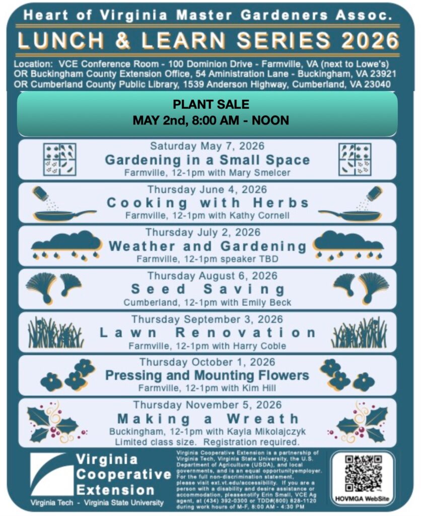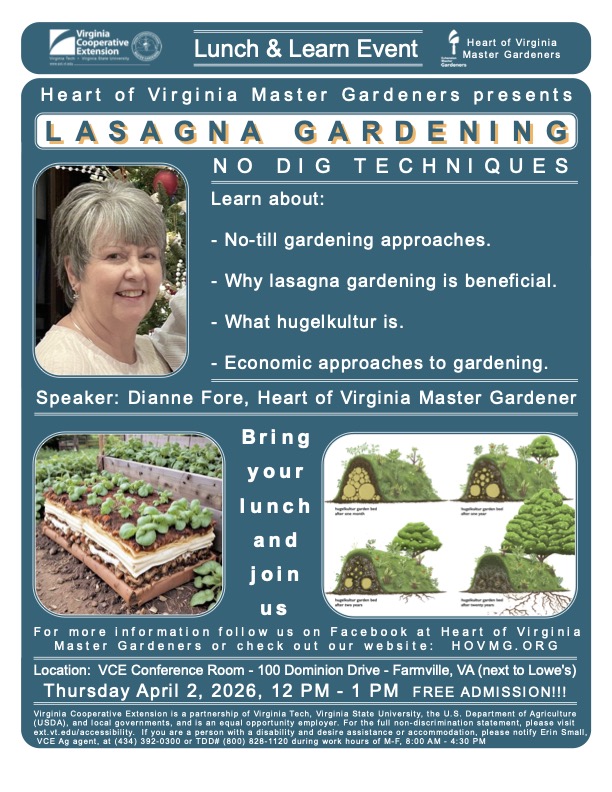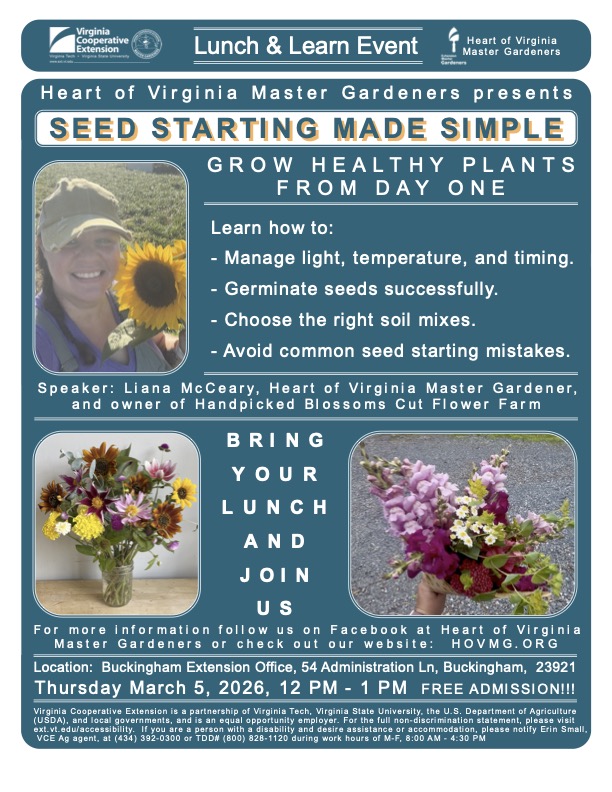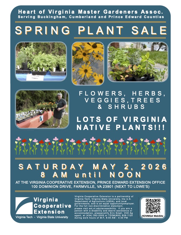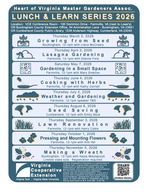 HOVMGA (Cumberland, Buckingham, and Prince Edward Counties) has planned an exciting year of monthly/timely FREE lunch hour workshops and other events just for you! Mark your calendar to join us for these events. Questions? Call our Prince Edward Virginia Cooperative Extension Office, 100 Dominion Drive, Farmville, VA 23901. (Next to Lowe’s) at 434-392-0300.